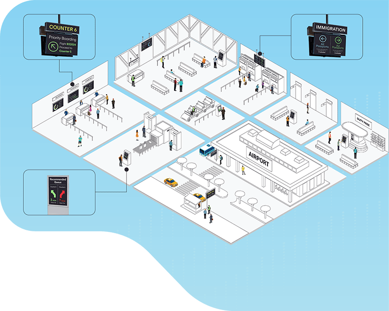Beseitigen Sie den Stress des Wartens in Warteschlangen oder an Servicepunkten. Stellen Sie sicher, dass die Passagiere auf der Grundlage von Echtzeit-Einblicken in den Passagierfluss und den Terminalbetrieb informiert werden.